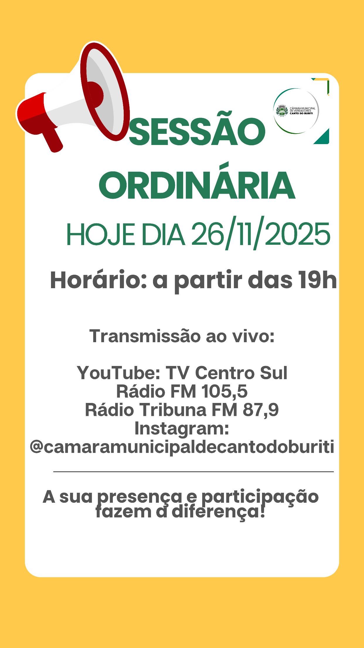 A Câmara Municipal de Canto do Buriti informa que realizará, nesta quarta-feira (26/11/2025), a Sessão Ordinária a partir das 19h, com transmissão ao vivo pelos canais oficiais.