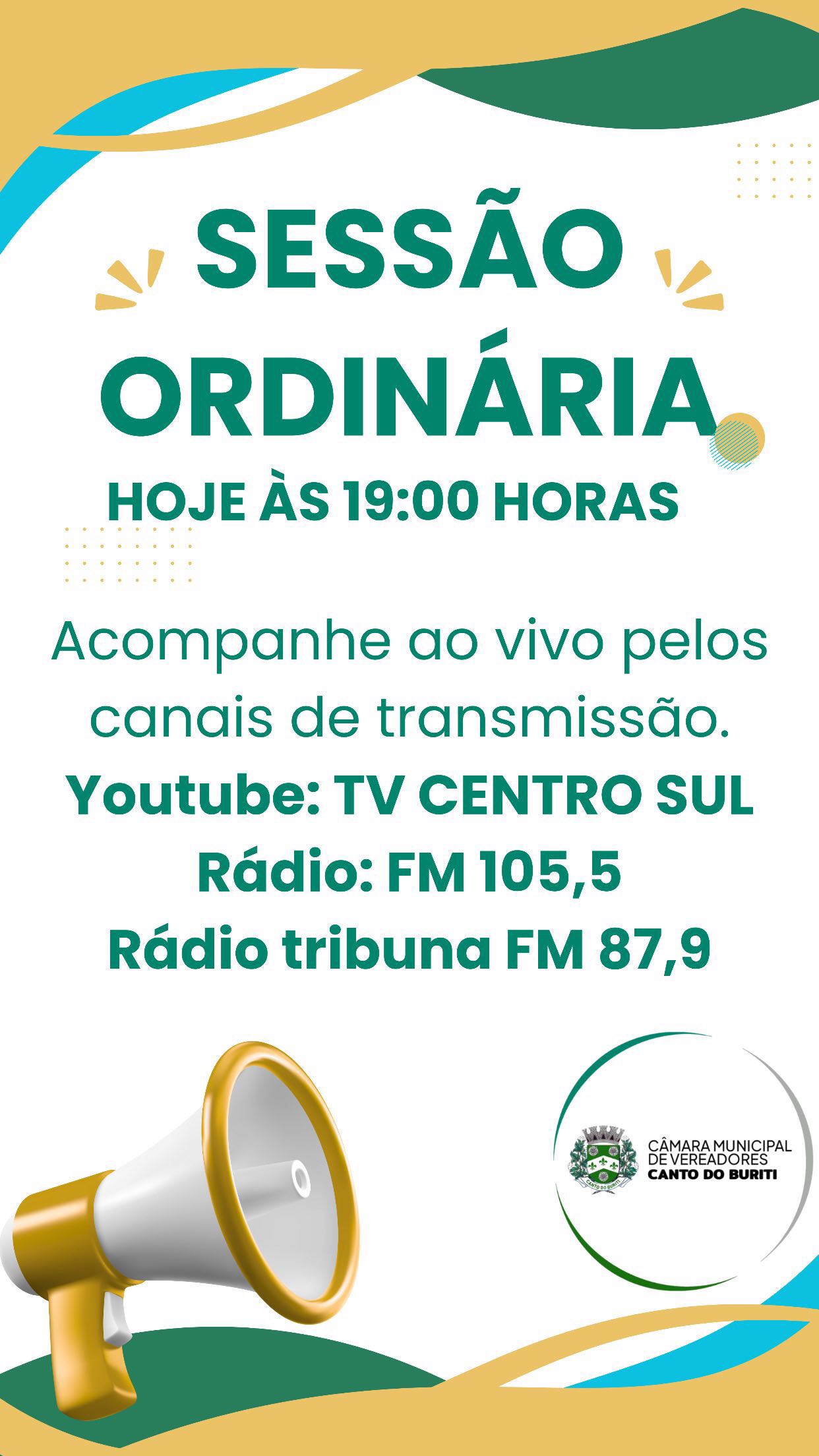 A Câmara Municipal de Canto do Buriti informa que realizará, nesta quarta-feira, uma Sessão Ordinária, com transmissão ao vivo pelos canais oficiais do Legislativo.