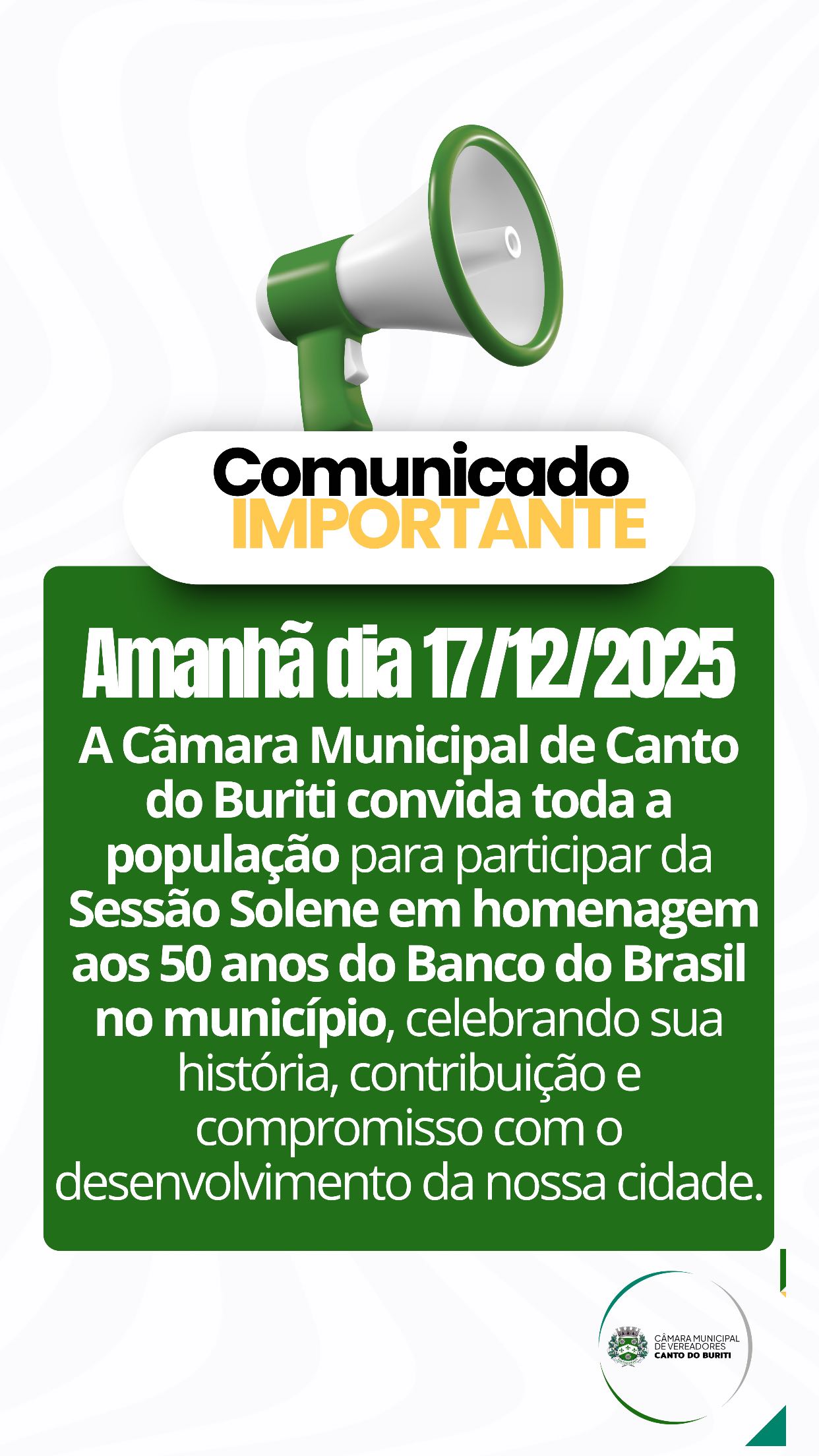 A Câmara Municipal de Vereadores de Canto do Buriti realizará, nesta terça-feira, 17 de dezembro de 2025, uma Sessão Solene em homenagem aos 50 anos de atuação do Banco do Brasil no município, reconhecendo a contribuição histórica da instituição.