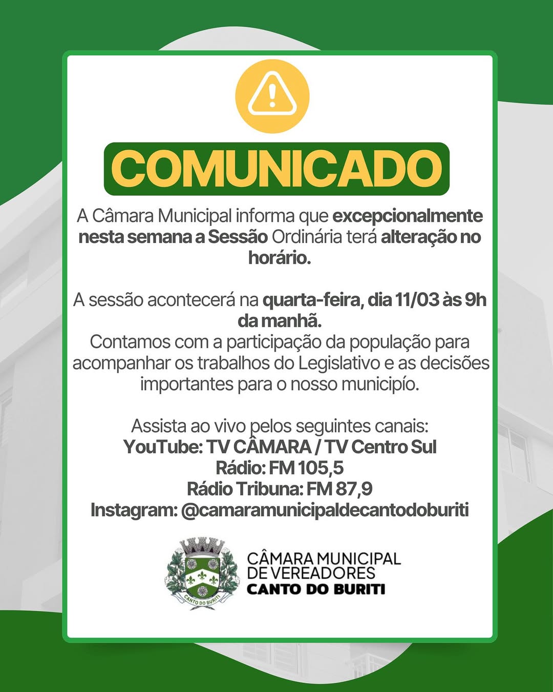 A Câmara Municipal de Canto do Buriti comunica que, excepcionalmente nesta semana, a Sessão Ordinária prevista para quarta-feira, 11 de março, será realizada às 09h da manhã.