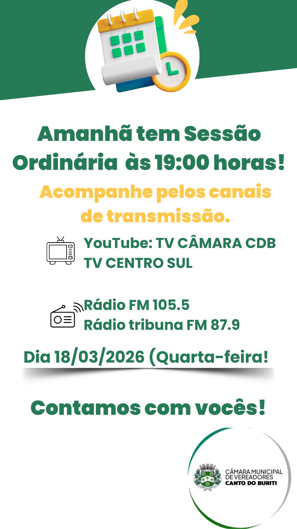 A Câmara Municipal de Vereadores de Canto do Buriti realizará Sessão Ordinária no dia 18 de março de 2026, às 19h, com transmissão ao vivo por canais digitais e emissoras de rádio.