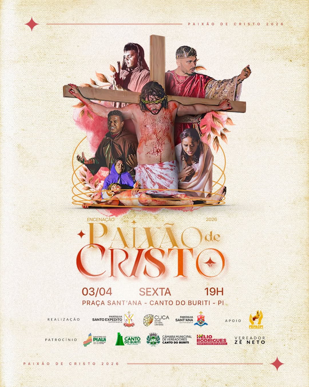 A Câmara Municipal de Canto do Buriti convida toda a população para prestigiar a tradicional encenação da Paixão de Cristo, que será realizada no dia 03 de abril, às 19h, na Praça Sant’Ana.