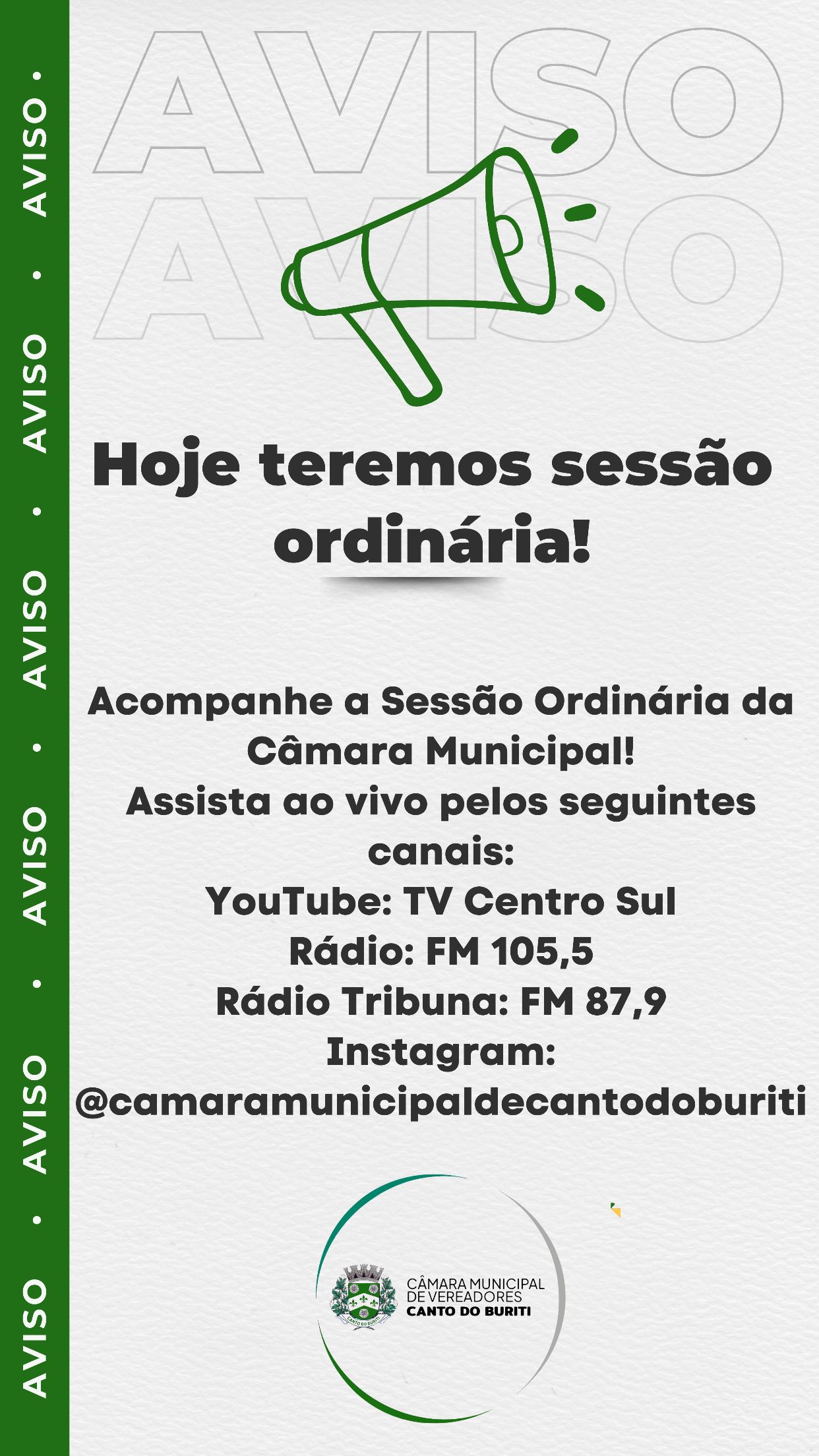 A Câmara Municipal de Canto do Buriti informa que realizará, nesta quarta-feira, uma Sessão Ordinária, com transmissão ao vivo pelos canais oficiais do Legislativo.
